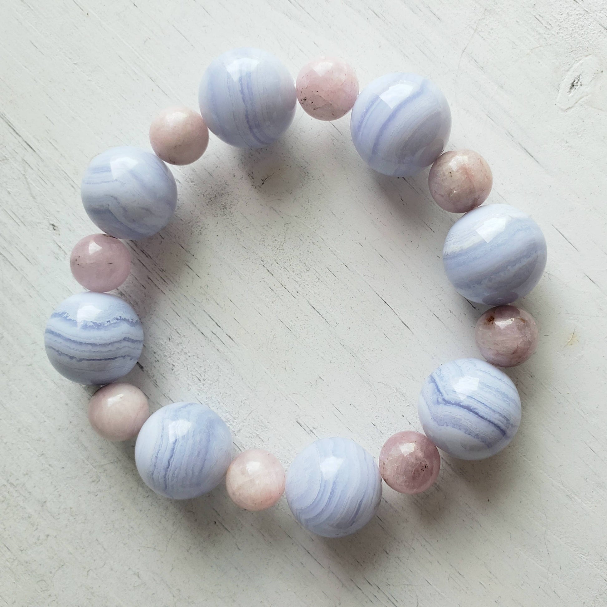 Perfectly matched blue and pink pastels make this stretch bracelet a go-to accessory. It combines pale pink 10mm kunzite and 20mm blue lace agate rounds.